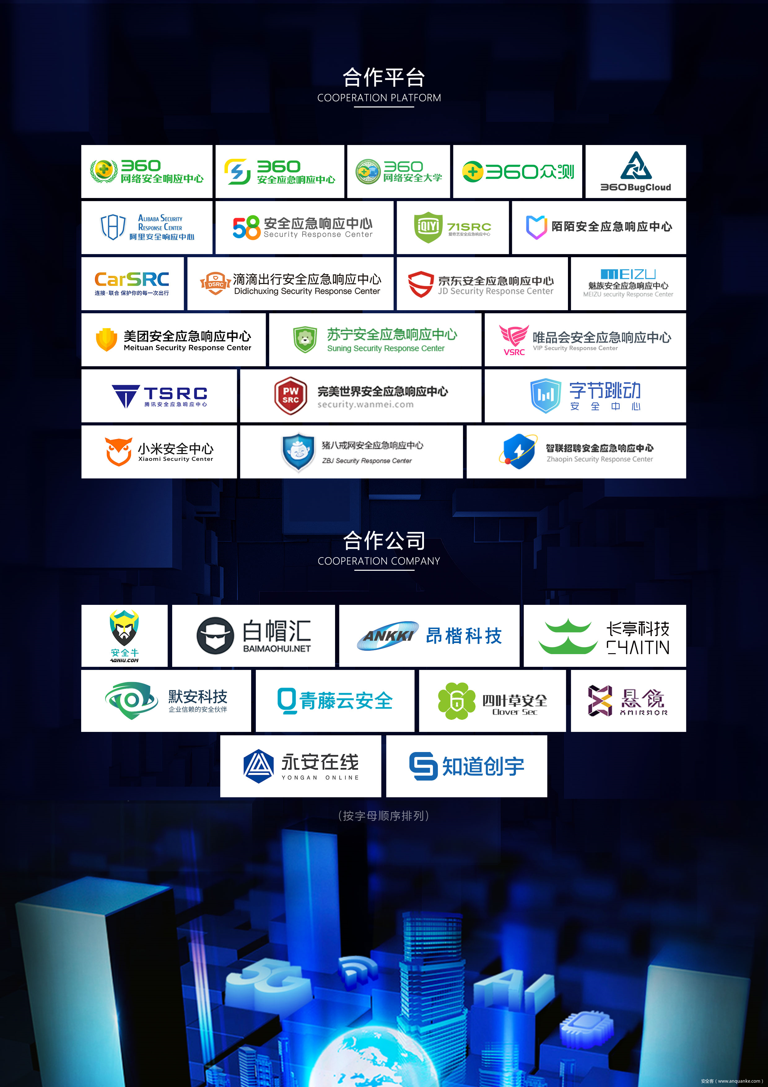 安全客在此向为本书的文章筛选、编辑及传播作出贡献的合作平台、合作公司、合作媒体、合作团队以及合作安全会议表示深深的感谢 !