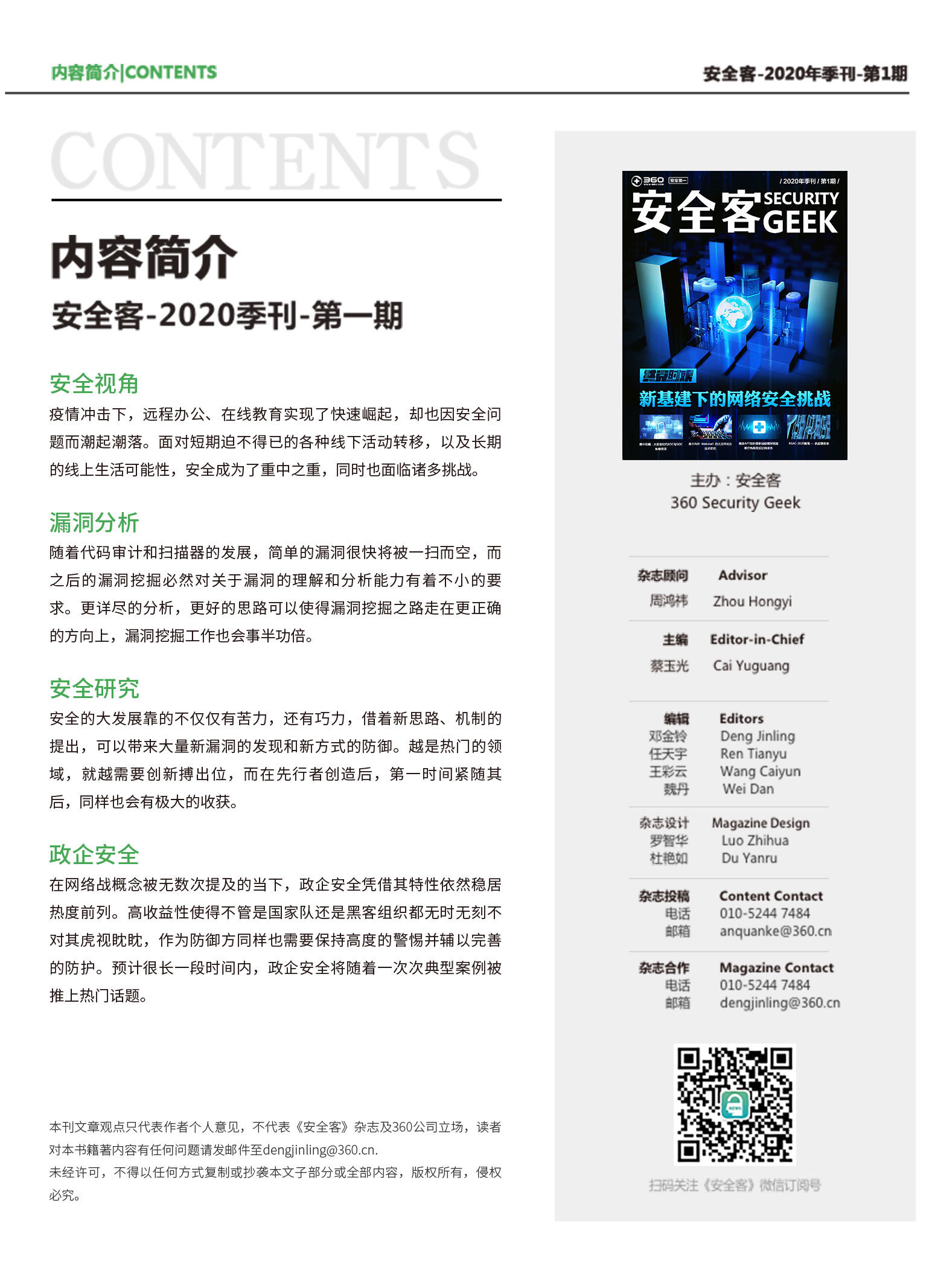 2017年年初,安全客的第一版电子年刊正式出版,一经发布立刻在安全圈内掀起一番读书热潮。今天安全客2020年第一季度季刊正式和大家见面,截至本次已经发布了14版,并且在上一季度中,安全客季刊创下累积800000+的下载量,这是安全客一直坚守质量为本、干货为首的成果凝集,也是安全客用户和白帽伙伴对季刊品质的认可,我们在此次季刊中,也将秉承严格把控质量的原则,为大家呈现最优质、最热门的技术分享内容。