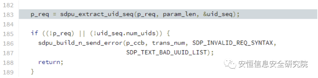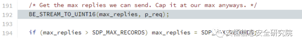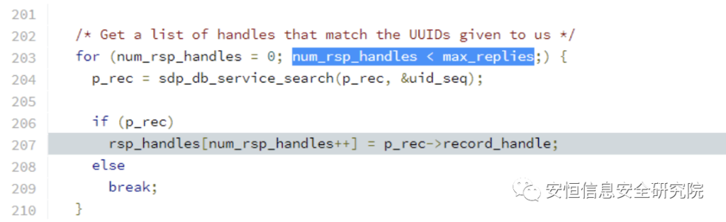 在得到 uid_seq 与 max_replies 后,SDP server 会找到所有与 uid_seq 匹配的 service record handle,并把它们存储在 rsp_handles 数组中。这些 handle 就是 client 请求的数据。max_replies 则用于限制这些 handle 的总数 num_rsp_handles(漏洞点),避免返回的 handle 数量超过 MaximumServiceRecordCount 的限制: