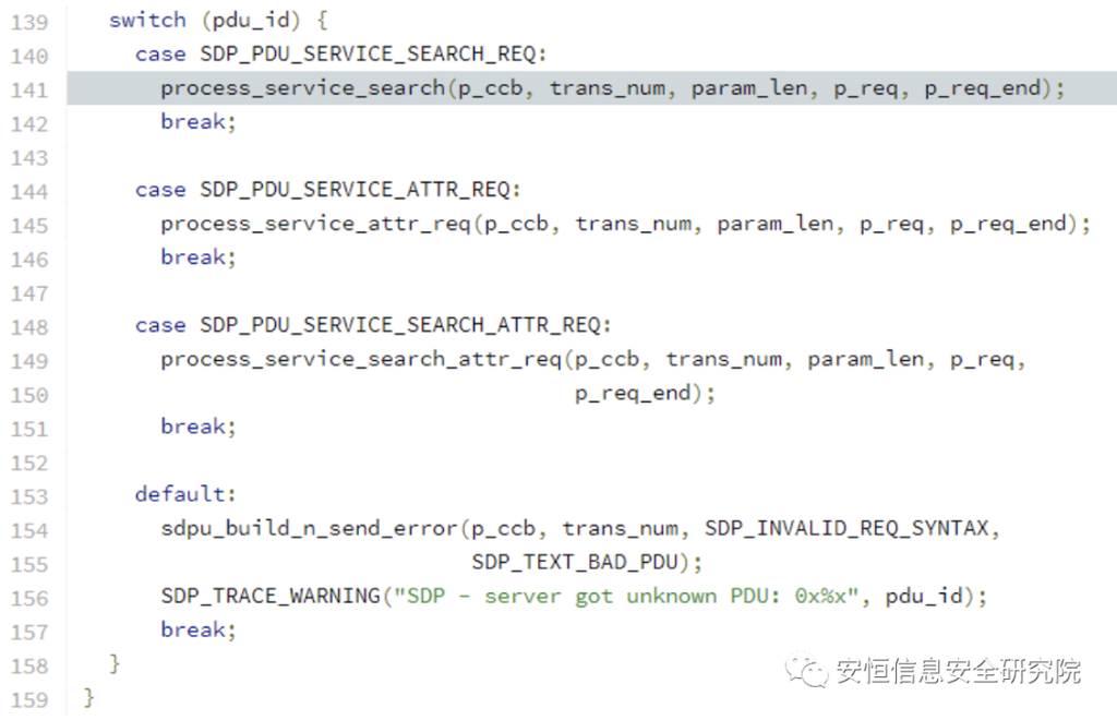 该函数会根据 PDU ID 判断当前 request PDU 的类型。当 request PDU 为 SDP_SERVICE_SEARCH_REQ PDU 时,进入 process_service_search() 做进一步处理: