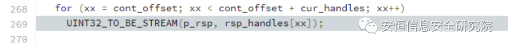 之后 SDP server 会把位于 cont_offset 到 cont_offset + cur_handles 之间的 handle 写入 SDP_SERVICE_SEARCH_RSP PDU。由于持续的 continuation state,会导致 cont_offset 不断增大,所以如下循环中的 rsp_handles[xx] 必然会发生越界读,最终导致内存泄露: