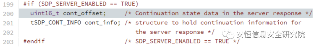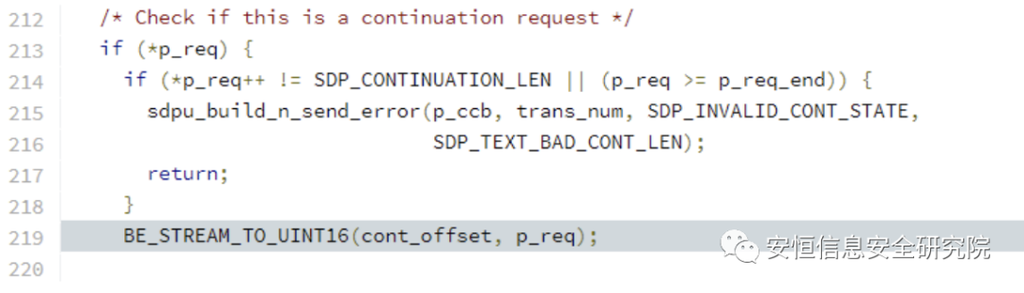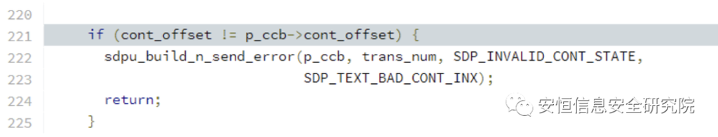 若当前处理的 request PDU 使能了 continuation state,SDP server 就会提取其中的 continuation information 字段,并存入 cont_offset。紧接着 Android 还会对 cont_offset 做安全检查,比较它与先前传给 SDP client 的值是否相等,防止攻击者恶意设置 offset 导致数组越界: