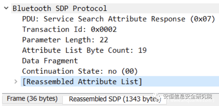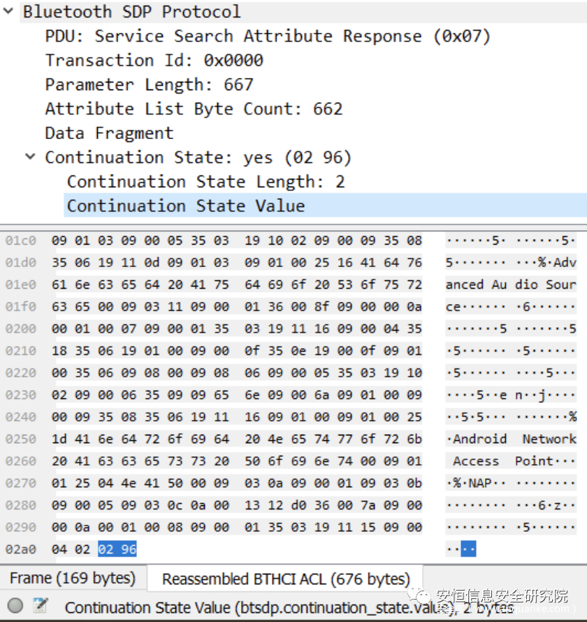 Bluetooth SDP ProtocolPDU:ServiceSearchAttributeResponse(0x07)TransactionId:0x0000ParameterLength:667AttributeListByteCount:662DataFragmentContinuationState: yes (0296)ContinuationStateLength:2ContinuationStateValue