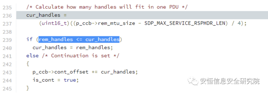 接下来 SDP server 会根据远端设备 L2CAP 配置的 MTU 计算当前 SDP_SERVICE_SEARCH_RSP PDU 中最多能携带的 handle 数量 cur_handles。显然下溢的 rem_handles 总是大于 cur_handles,导致 continuation state 恒使能: