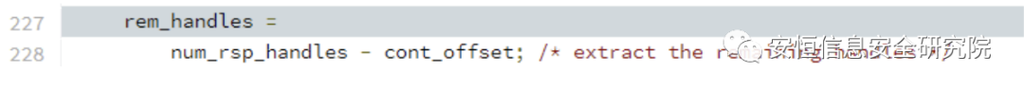 在 num_rsp_handles 值为 1 的情况下继续跟踪代码。当 continuation state 使能时,SDP server 会使用 num_rsp_handles 减去 cont_offset(已经传输的数量),从而得到剩余需要传输的 handle 数量 rem_handles。由于 num_rsp_handles 被攻击者篡改为了 1,且 rem_handles 的类型为 uint16_t,所以 rem_handles 发生 underflow: