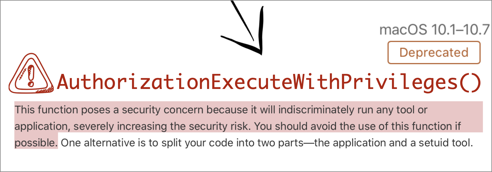 我曾经多次提到过关于Apple公司明确指出不应该再使用AuthorizationExecuteWithPrivileges API的问题。原因就是此API没有验证将要执行的二进制文件(且是要以root权限运行)。这意味着本地没有高权限的攻击者或者恶意软件可以暗中篡改、替换它,从而将他们的权限升级到root:
