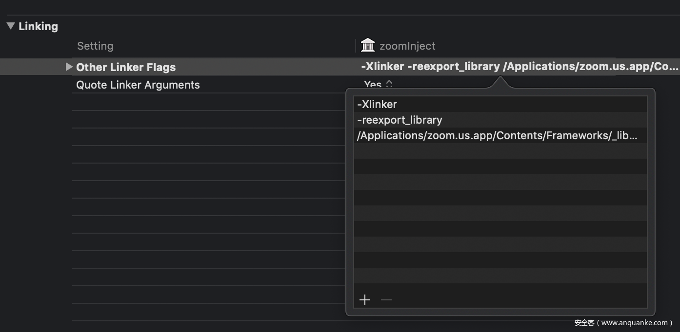 为了创建所需的链接器指令,我们在Xcode的“Other Linker Flags” 下添加-XLinker -reexport_library,然后添加目标代理库的路径: