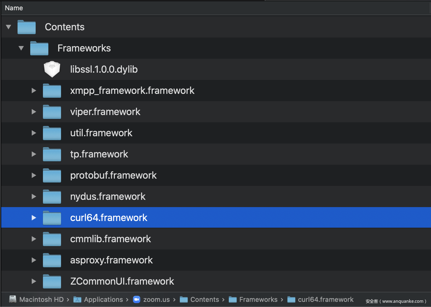通过Zoom的应用程序包,我们可以确认curl的存在(以及其他许多框架和库)且他们会在Zoom启动时全部加载: