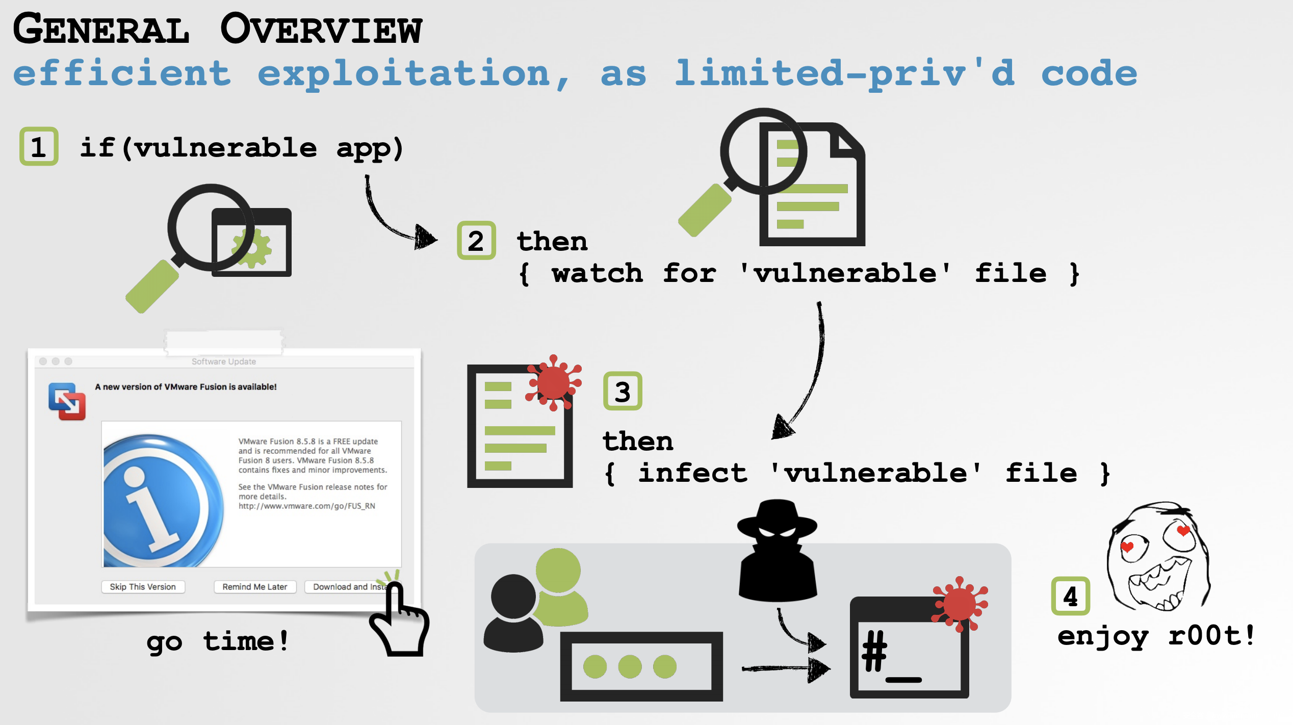 尽管我们今天要讨论的安全问题仍未解决(注:文章写作之时还未修复,现已修复),但它们都是本地安全问题。也就是说恶意软件或者攻击者如果想利用这些漏洞,需要在macOS系统中已然成功驻留。