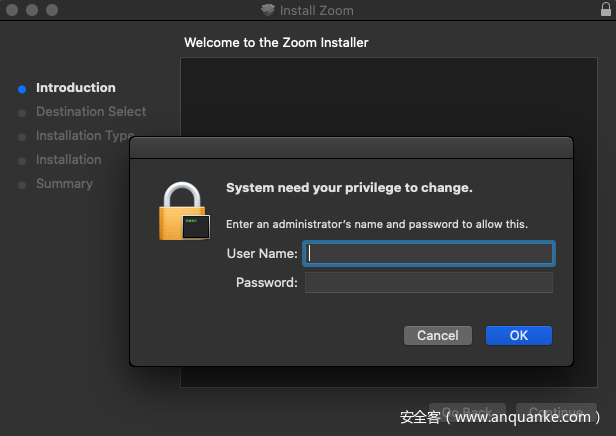 如果用户在正常模式(非管理员)下安装Zoom,安装器会弹出以下窗口请求管理员凭据: