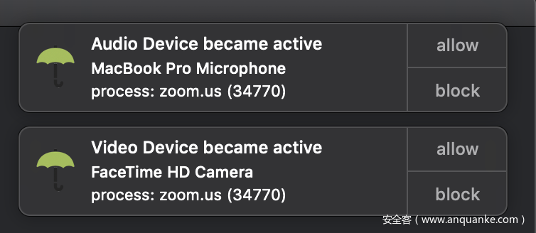 前者的问题在于许多企业(现在)使用Zoom来(可能)进行敏感的商务会议,而后者的问题在于即使没有macOS警报或提示,恶意软件仍然可以秘密地访问麦克风或网络摄像头。