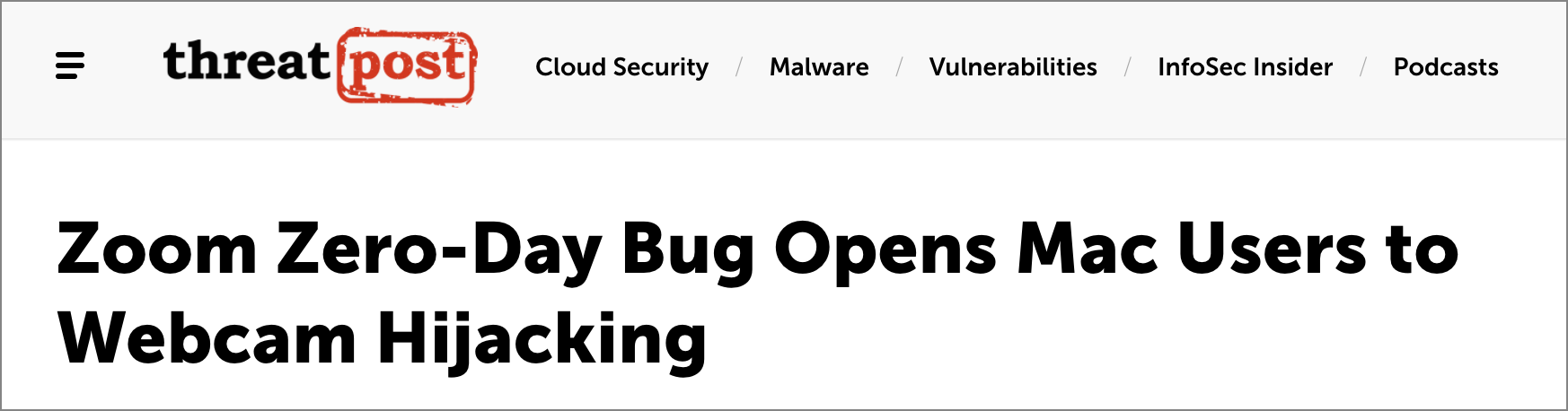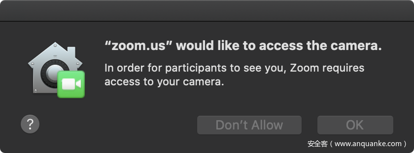2019年6月,安全研究员乔纳森·莱切德(Jonathan Leitschuh)在Mac上的Zoom客户端中发现了一个可利用的远程0day漏洞,使得任意恶意网站能够在未经用户允许的情况下启动用户的摄像头😱。