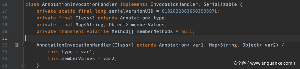 之前已经简单介绍过了什么是反序列化,JDK序列化/反序列化。如果反序列化的类里有readObject方法,那么就一定会调用该方法。这就给了我们一个可趁之机,我们观察一下AnnotationInvocationHandler对象中都执行了些什么。
