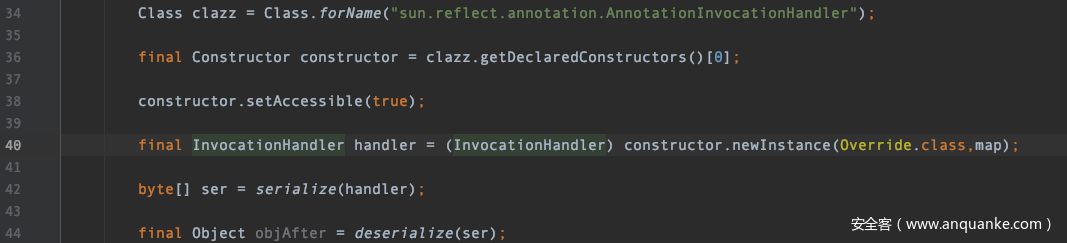 我们看到我们通过反射先是拿到了AnnotationInvocationHandler此类的Class对象,然后在通过该Class对象以反射的形式拿到了它的构造方法,并最终通过该构造方法反射并传入两个参数一个是Override.class一个常见的注解类对象。而另一个就是我们之前所分析的可以通过调用Map.entrySet()方法可以造成代码执行的Map对象。