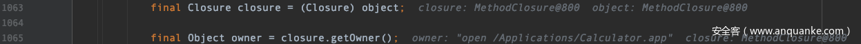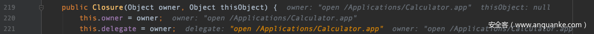 可以看到我们将要执行的命令传给了MethodClosure的父类来处理,将“execute”赋值给了MethodClosure.method属性。然后紧接着跟到Closure的构造方法中看到命令被赋值给了Closure.owner和Closure.delegate属性,之所以讲这些赋值过程是因为后面都会用得到。