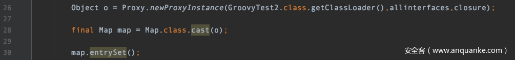 然后返回到我们之前的payload中我们可以看到我们使用Proxy.newProxyInstance方法生成了一个代理对象,然后将其强转成了一个Map对象然后调用了entrySet方法。
