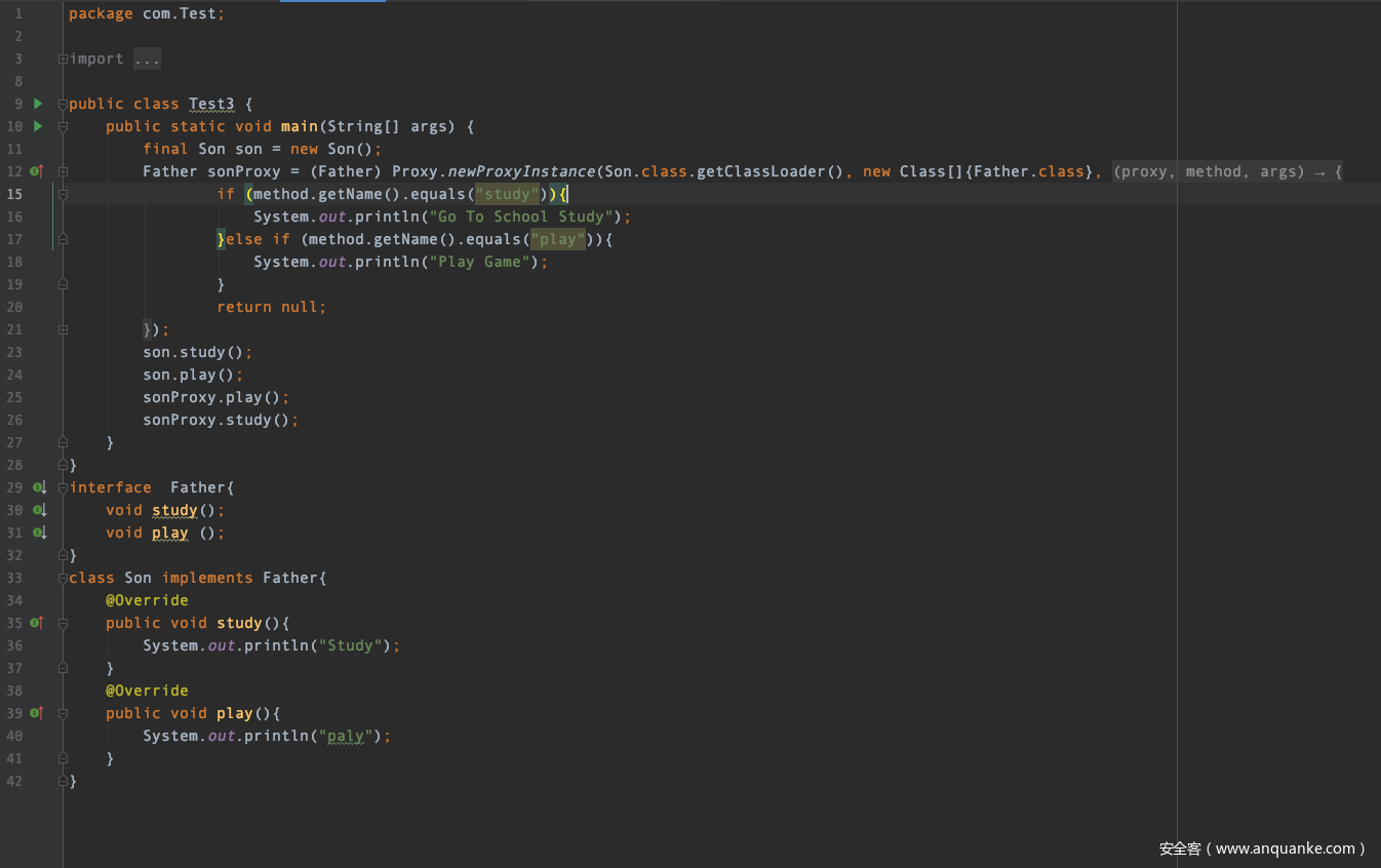 我们可以看到我们写了一个Son类继承了Father接口,然后在Test3类中的main方法中被实例化,接下来我们通过Proxy的newProxyInstance方法生成了一个Son对象的代理,我们传递了三个参数进去,Son类的类加载器和实现的接口,这里注意被代理的对像是一定要实现至少一个接口的,因为实例化的代理类本身是继承了Proxy类,所以只能通过实现被代理类接口的形式来实例化。最后我们通过匿名内部类的形式传入了一个InvocationHandler对象,InvocationHandler是一个接口,该接口中只有一个方法就是invoke方法,所以我们一定要重写该方法。