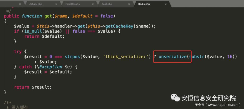 查看ThinkPHP的Redis的获取数据代码,发现如果值以think_serialize:开头就可以触发反序列化。