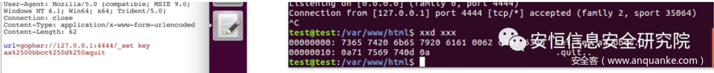 但是使用url=gopher://127.0.0.1:6379/_set key aa%2500bbcc%250d%250aquit时,仍然超时,猜测可能被截断,但是对比nc数据包发现和发送数据一致。