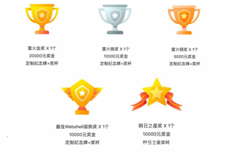 为奖励白帽英雄对 Webshell 检测事业的燃情贡献,本次特设 100 万的奖 金池,对于每个成功绕过“雷火引擎”的 Webshell 黑样本,给予最高 1000 元 现金奖励!根据积分排名,还设置了金奖 20000 元、银奖 10000 元、铜奖 5000 元,以及 WebShell 最佳姿势奖 10000 元、明日之星奖 10000 元。此外,根据 终积分,火线平台将给予参赛选手丰厚的额外奖励,活动结束后可至火线平台领取(huoxian.secnium.cn)。