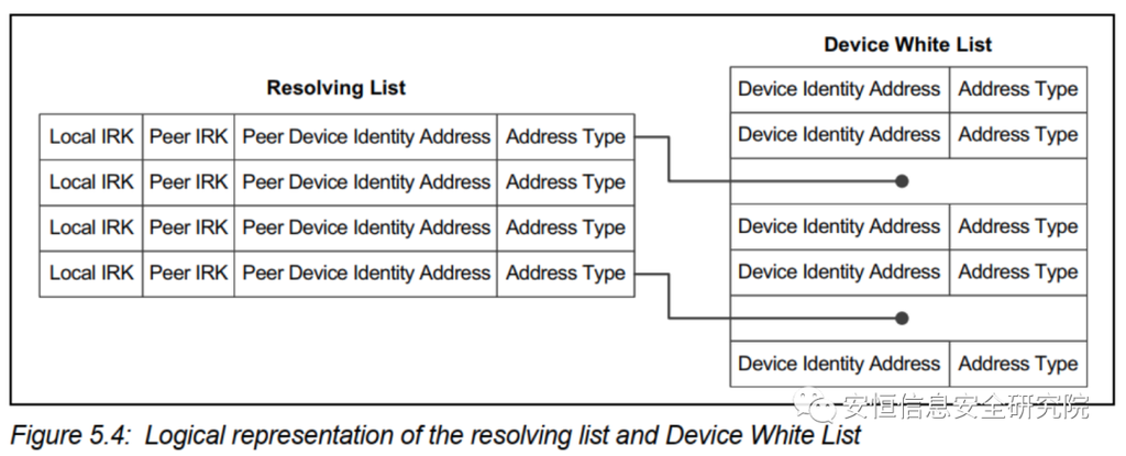 之后对端设备收到一个包含 RPA 的 advertising PDU 后,会尝试使用本地存储的 IRK (peer IRK) 计算 localHash = ah(IRK, prand)(其中 prand 从 RPA 中提取),然后将结果 localHash 与 RPA 中包含的 hash 比对。如果两者相同,那么地址解析成功。之后再找到与 peer IRK 对应的 peer device identity address 就可发起连接。