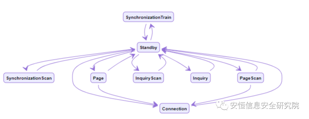 BR/EDR 设备在不同的 link controller 状态中传输 baseband packet 时,将携带不同的 access code。LAP 则会参与这些 access code 的计算。Link controller 状态机如下: