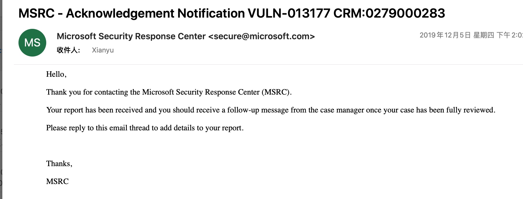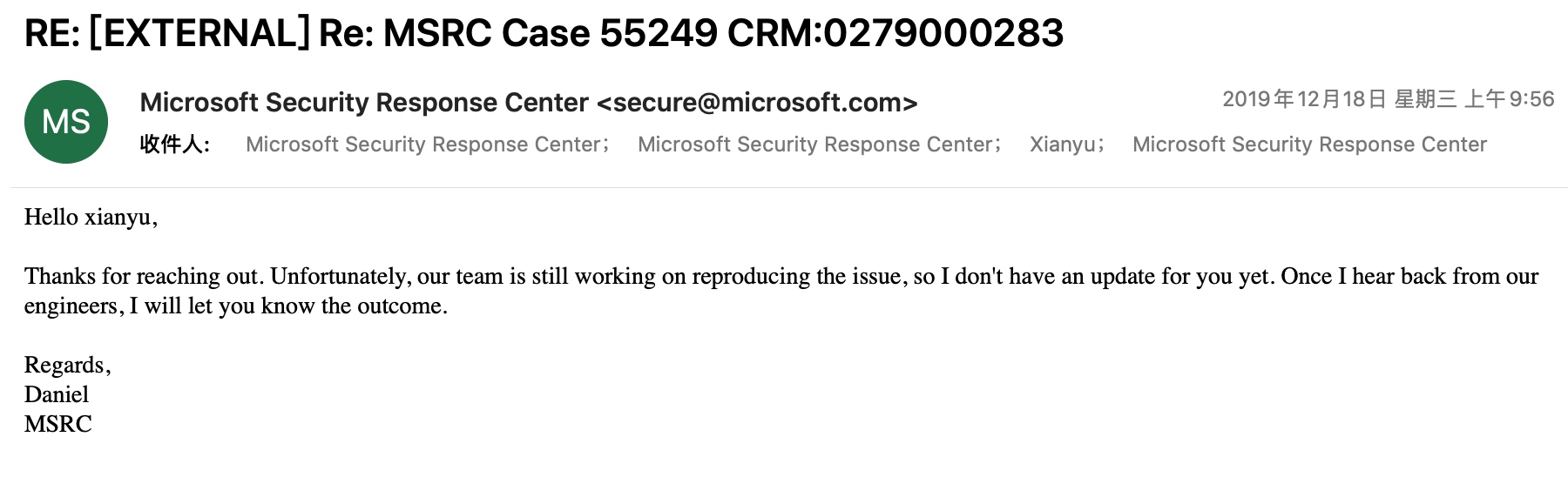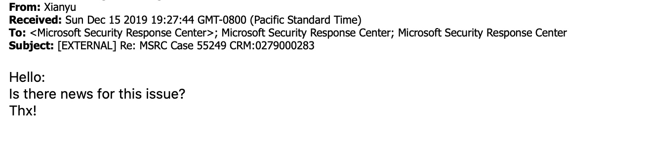 2019年12月15日 向MSRC发邮件询求进度,微软2019年12月18日回复