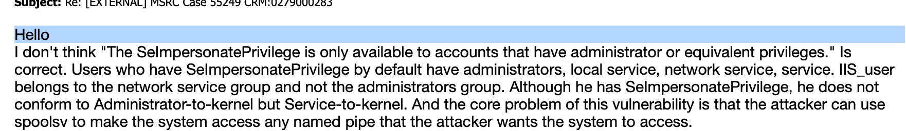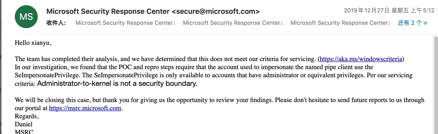 2019年12月27日 MSRC 回信认为impersonate的权限需要administrator或者等同用户才拥有,Administrator-to-kernel并不是安全问题。事实上,所有的service 用户(包括local service,network service 都具备这个权限)。我们向MSRC发邮件反馈此事