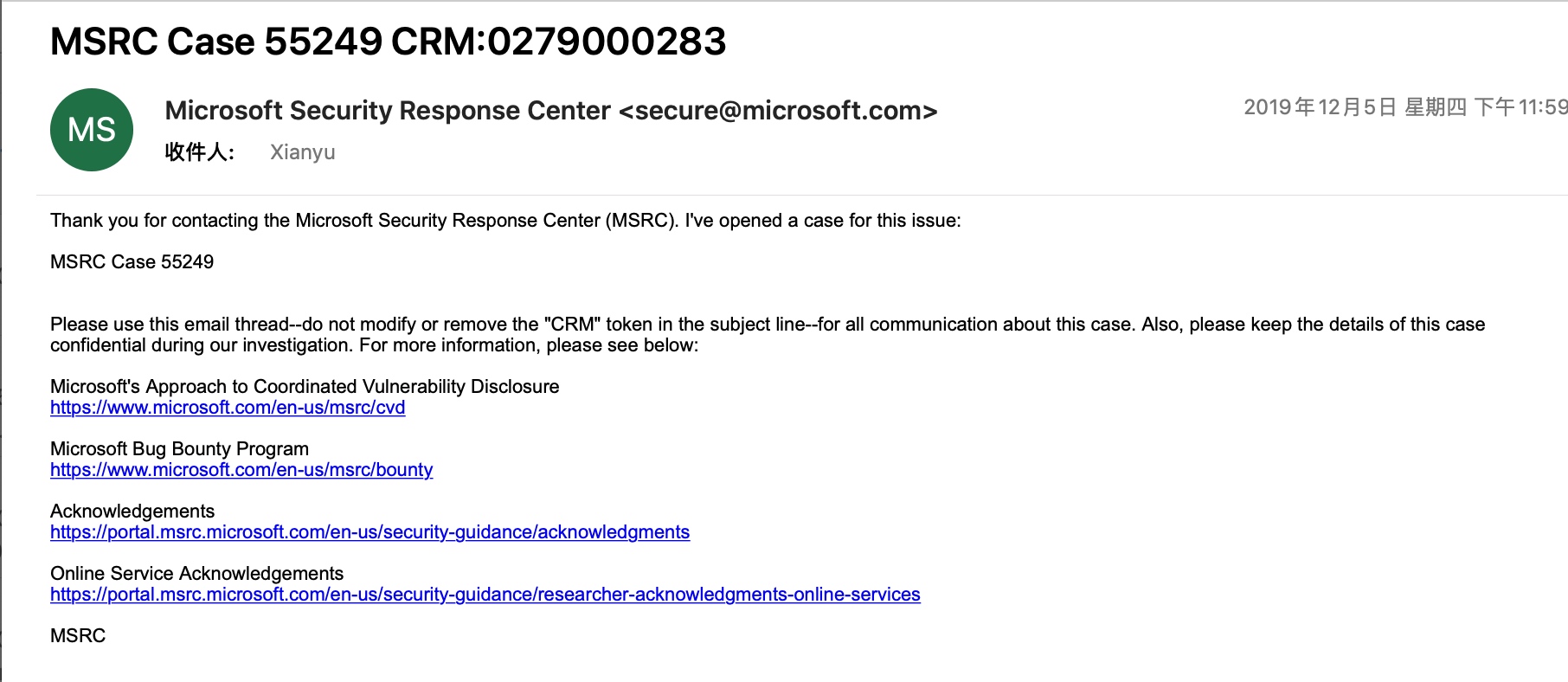 2019年12月5日 分配Case编号 MSRC Case 55249