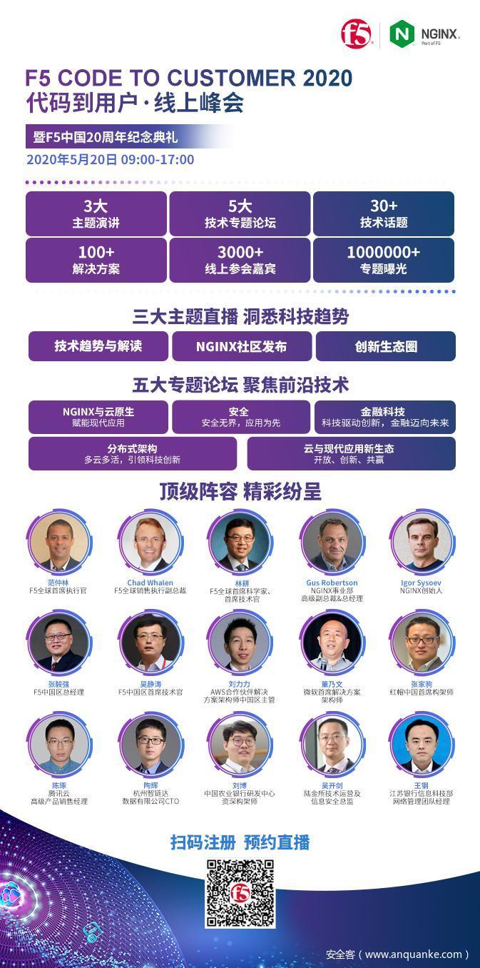 2020年5月20日,F5“代码到用户”线上峰会,暨F5中国20周年纪念庆典将正式拉开帷幕。