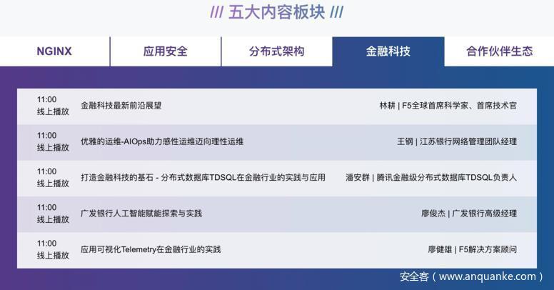 同时,金融科技板块也有更多精彩内容和技术干货将于5月20日上午11点同步开放。F5“代码到用户”线上峰会详情:搜索“F5社区”网站或者关注F5Networks公众号。