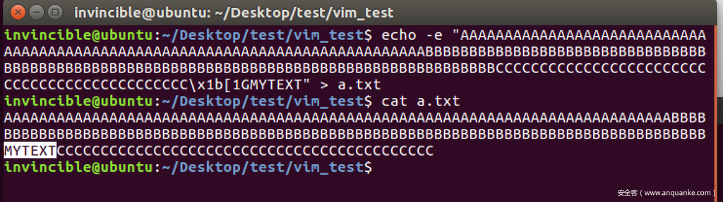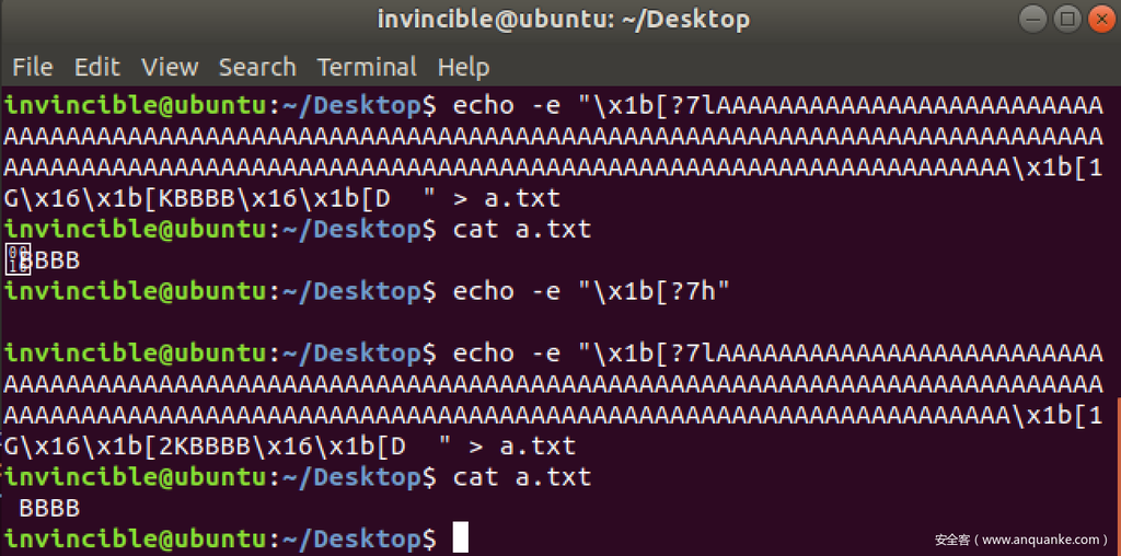 $ echo -e "AAAAx1b[1Gx1b[KBBBB" > a.txt