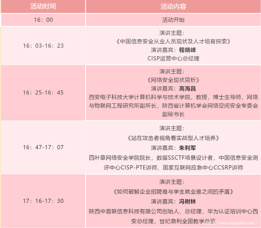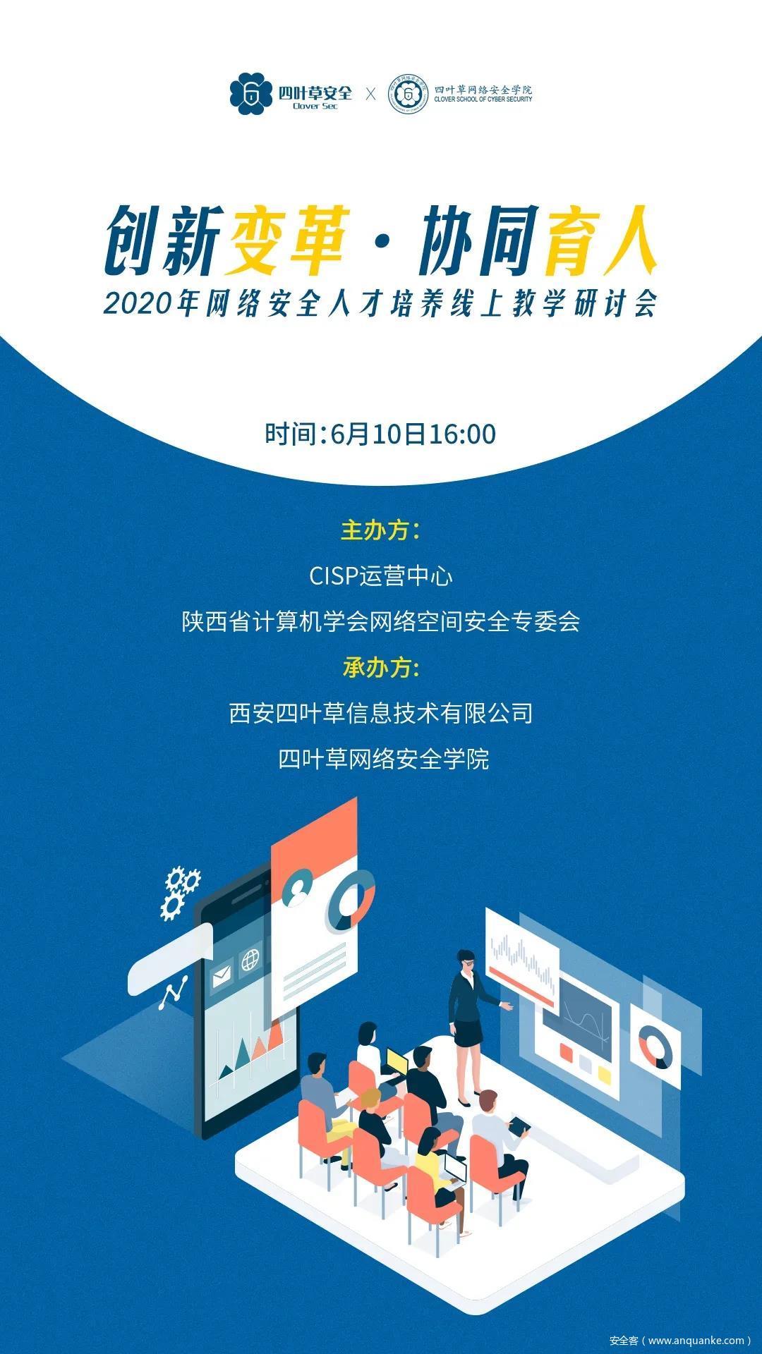 在此背景下,由CISP运营中心、陕西省计算机学会网络空间安全专委会主办,西安四叶草信息技术有限公司、四叶草网络安全学院承办的“2020年网络安全人才培养线上教学研讨会”将于6月10日(星期三)在线上平台开启,举办此次活动,旨在贯彻落实《网络安全法》中对于加强网络安全人才培养及交流的政策要求,充分发动网络安全人才在各个行业的信息安全专业人才优势,在服务国家网络安全保障的同时,发现和聚集优秀的网络安全人才,使讲师更好地开展线上教育教学工作,更好的提升讲师教学学术的水平,聚焦信息时代的教学设计和学生学习成效,增强网络安全人才交流合作。