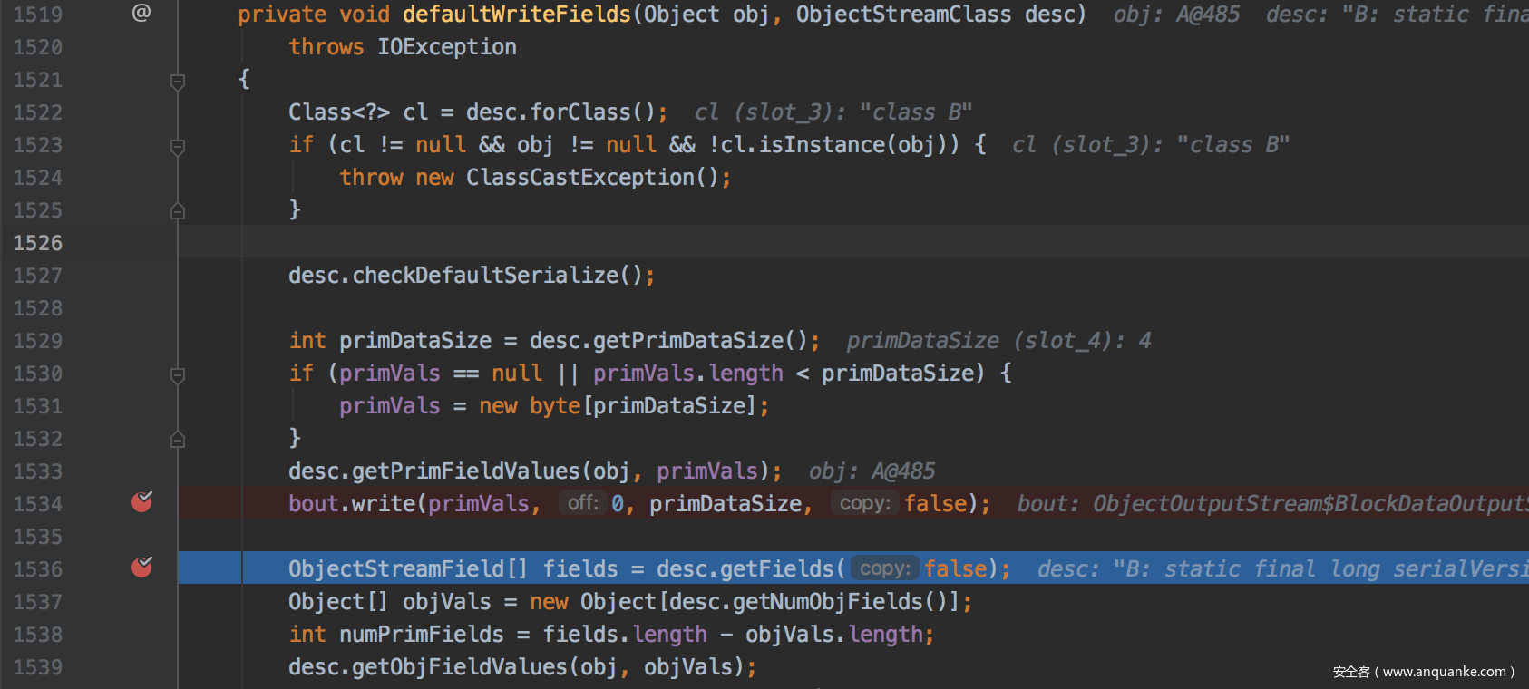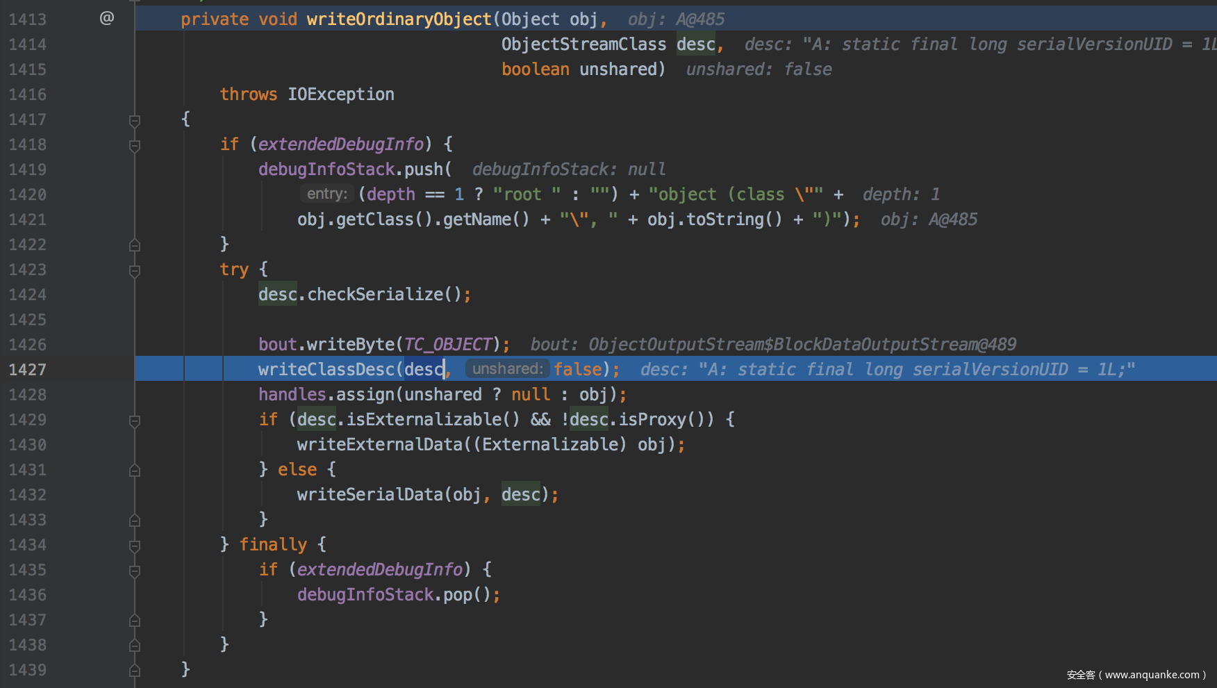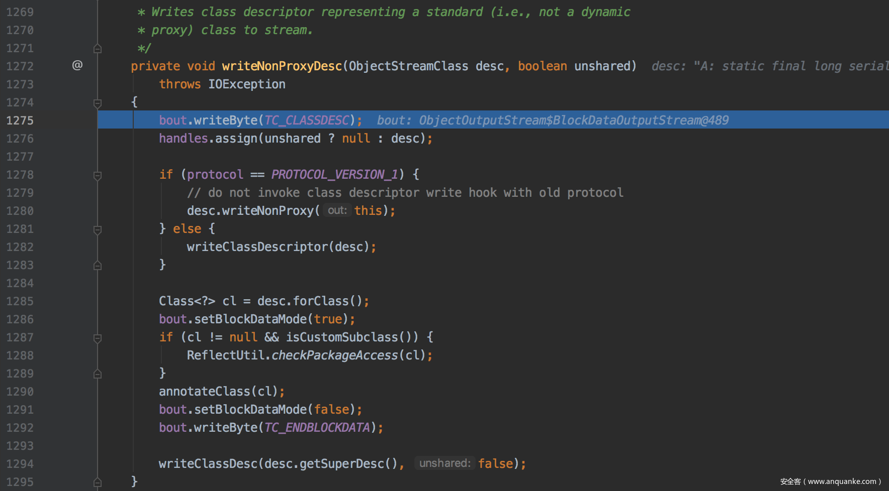 1426行写入TC_OBJECT,常量TC_OBJECT的值是(byte)0x73,1427行调用writeClassDesc方法,然后会调用到java.io.ObjectOutputStream#writeNonProxyDesc方法