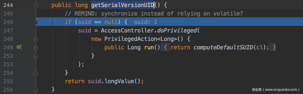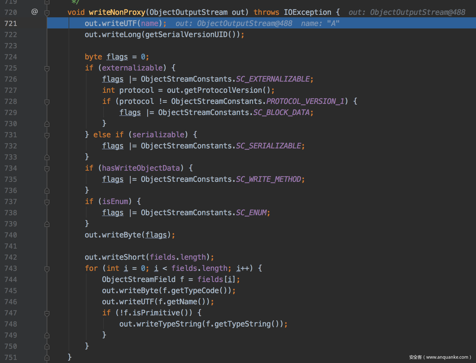 721行先写入对象的类名,然后写入serialVersionUID的值,看下java.io.ObjectStreamClass#getSerialVersionUID方法