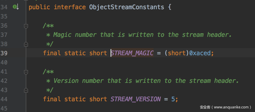 STREAM_MAGIC 16进制的aced固定值,是这个流的魔数写入在文件的开始位置,可以理解成标识符,程序根据这几个字节的内容就可以确定该文件的类型。