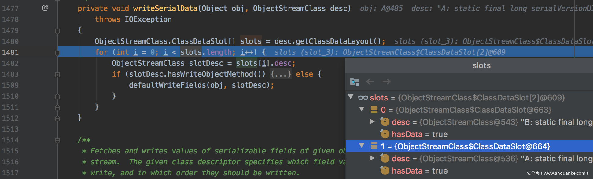 接着调用writeSerialData(obj, desc)写入对象属性的值,调用java.io.ObjectOutputStream#writeSerialData