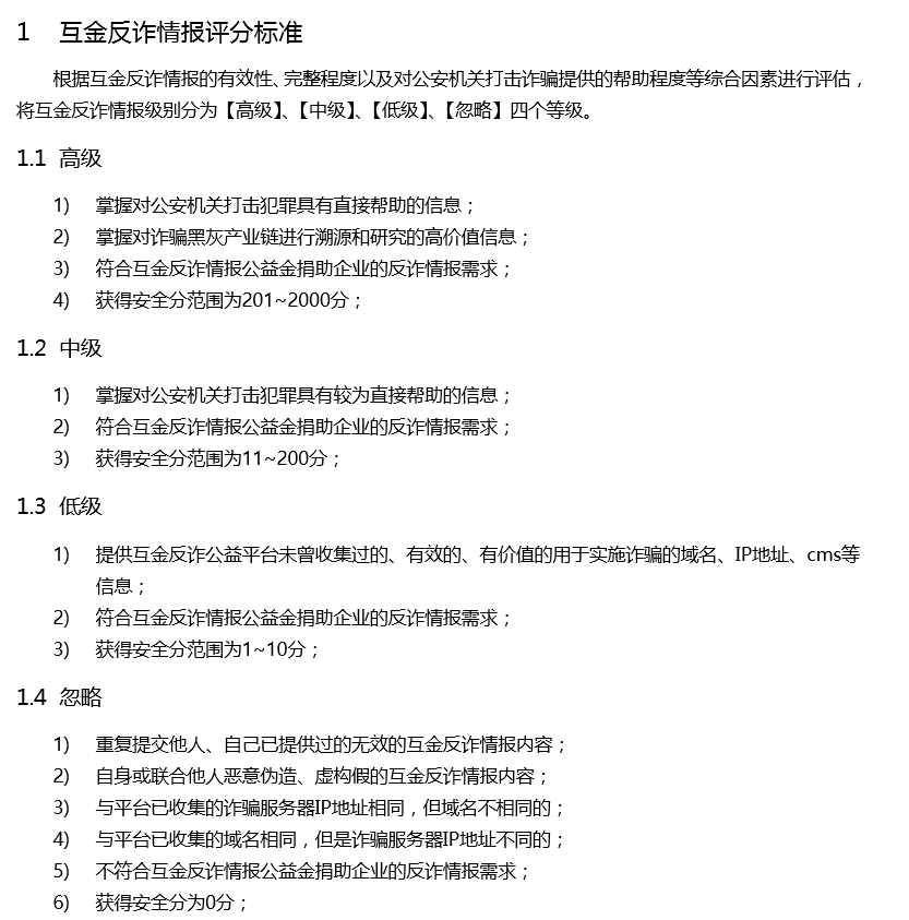 当前《度小满安全应急响应中心互金反诈情报处理规则》关于评分标准的内容节选: