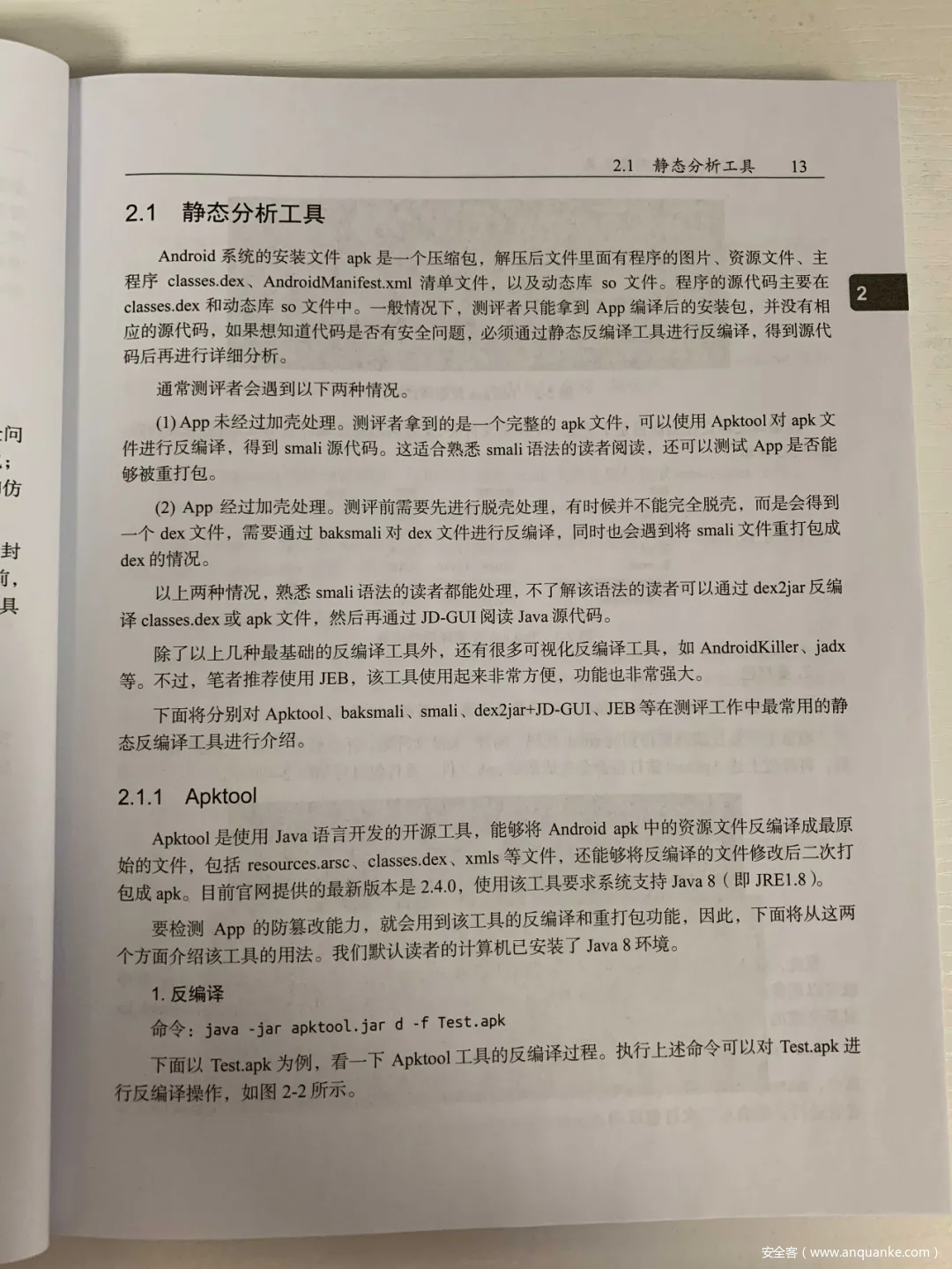 第 2 章,介绍测试工具。包括 App 安全测试过程中所需要使用的测试分析工具,从静态分析、动态分析、抓包分析、挂钩框架 4 个方面具体介绍 10 种以上必要工具的使用方法。