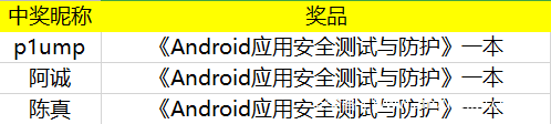 恭喜以上小伙伴获得《Android应用安全测试与防护》 一本, 请在6月24日18:00前,加入安全客活动3群:830462644,联系管理员@安全客发送邮寄地址吧~