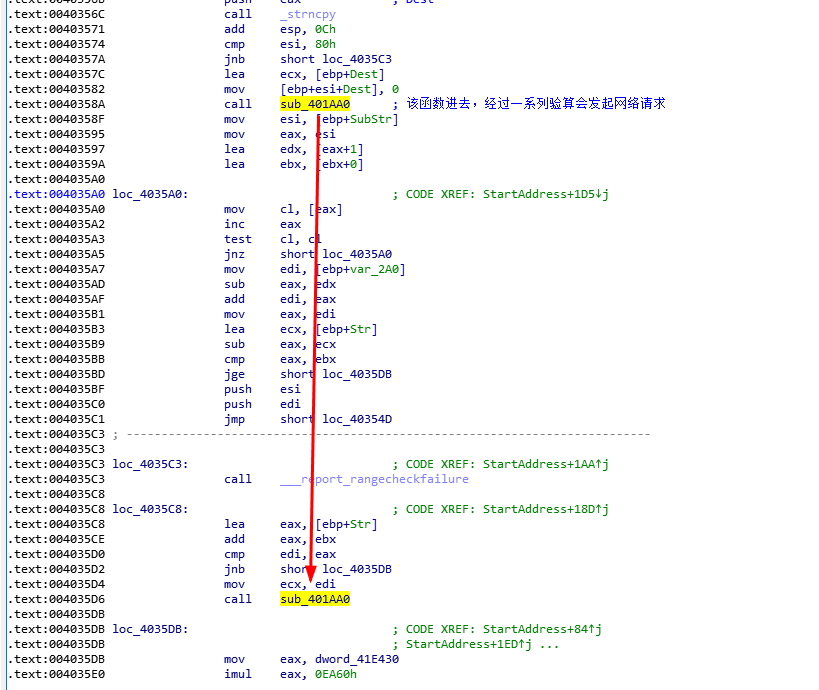 比如我对InternetOpen进行交叉引用,一层一层往上找,最后可以发现通过WinMain函数中StartAddress的sub_401AA0调用,可以来到网络请求的地方。我们可以对sub_401AA0进行初步的标注: