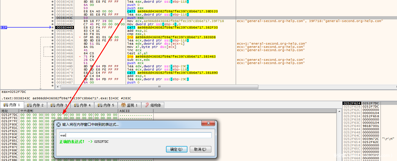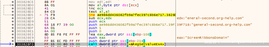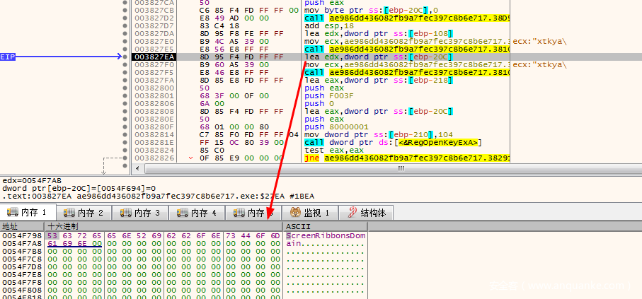 我们还是直接在003827E5这里设置断点,运行过来,然后在内存窗口中跟随edx,F8执行之后,解密得到ScreenRibbonsDomain