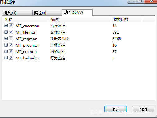 接着选择动作过滤,暂时不显示注册表操作: