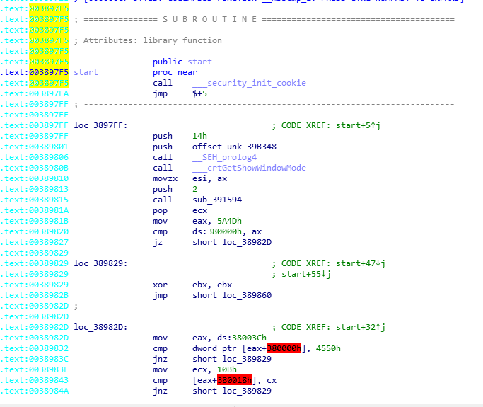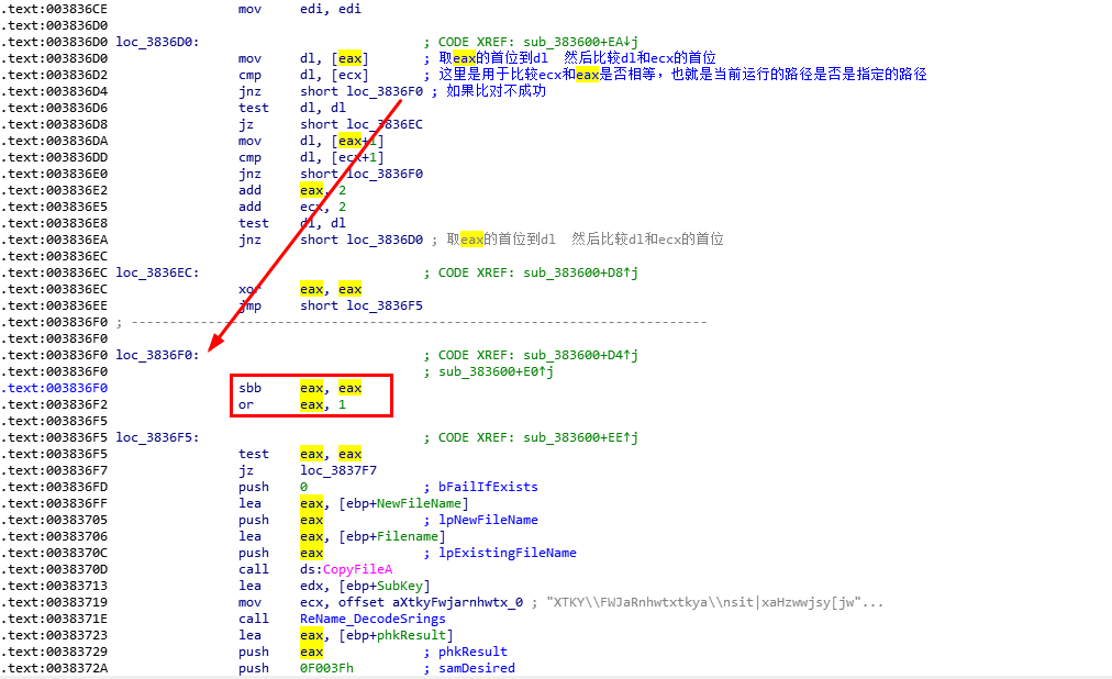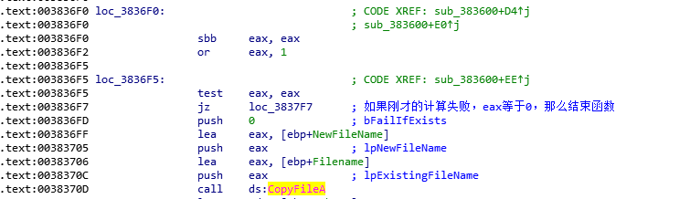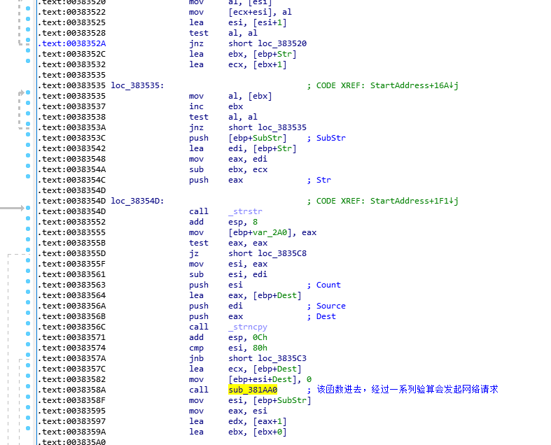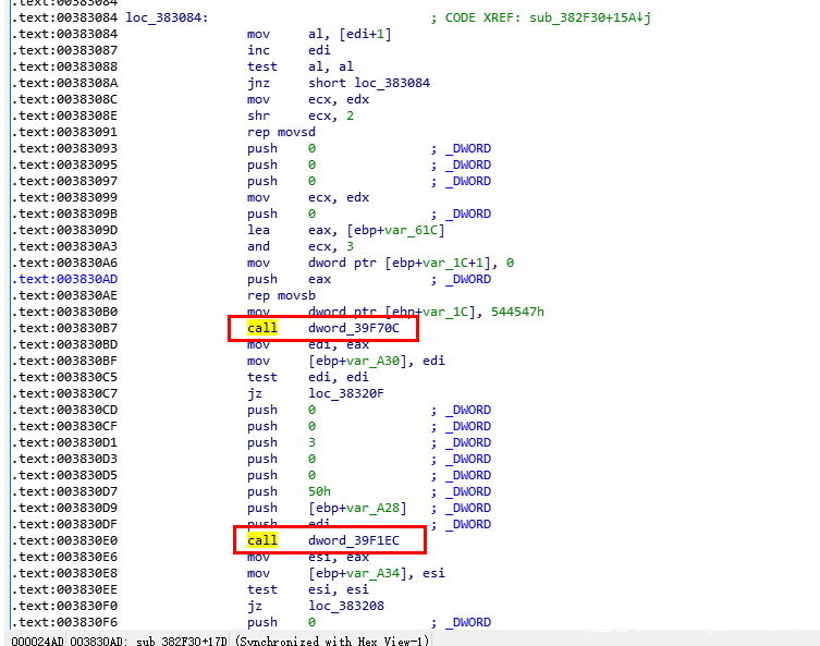且我们可以看到,sub_382F30调用完成之后,会检查eax(返回值)是否为1,如果不等于1,则跳转到loc_3835DB