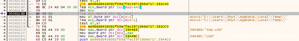 接着解密了一个路径:%temp%tmp.LOG,暂时不知道该文件用于干什么,反正不是从服务器下载文件保存到这里就是收集本地数据保存到这里然后上传。