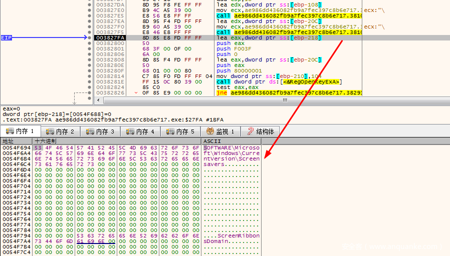 接着通过RegOpenKeyEx打开之前打开过的SOFTWAREMicrosoftWindowsCurrentVersionScreensavers