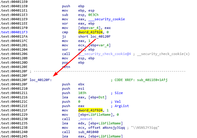 进入到sub_4011E0,程序会先判断dword_41F924的值是否为0,如果等于0则跳转到loc_40120F继续执行,且这里我们可以看到,在下面0040121F的地方,程序通过mov dword_41F924,1的方式给dword_41F924赋值为1。所以我们可以知道这里是程序首次运行的时候才会执行的代码。