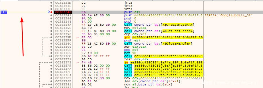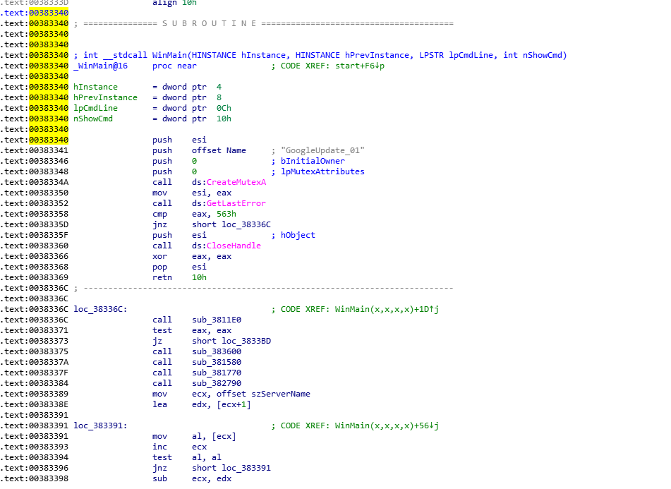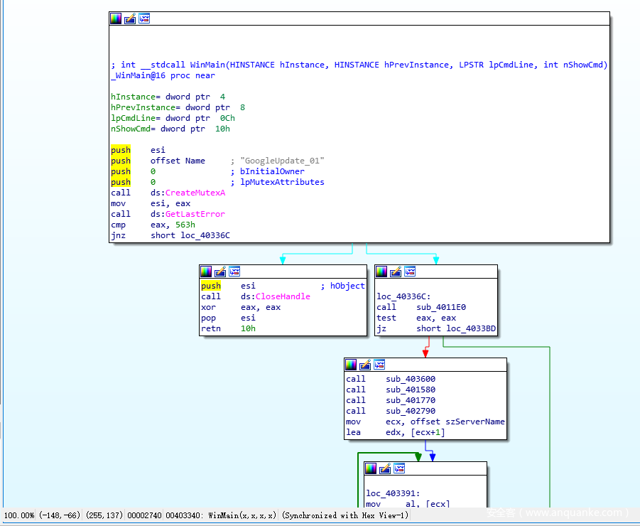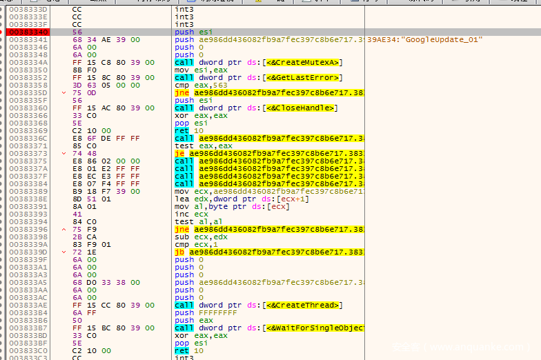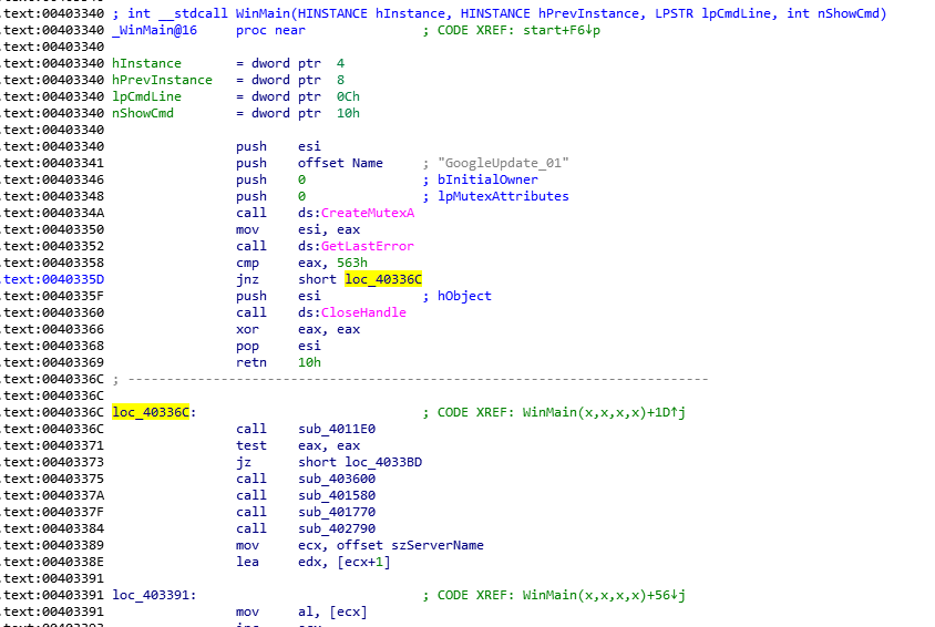 程序最开始会通过CreateMutex尝试创建一个名为<GoogleUpdate_01>的互斥体,接着通过GetLastError获取最后一次错误,这里如果获取到的值不是563h(十进制1379)则跳转到后面的loc_40336C继续执行,否则就退出WinMain,结束进程。